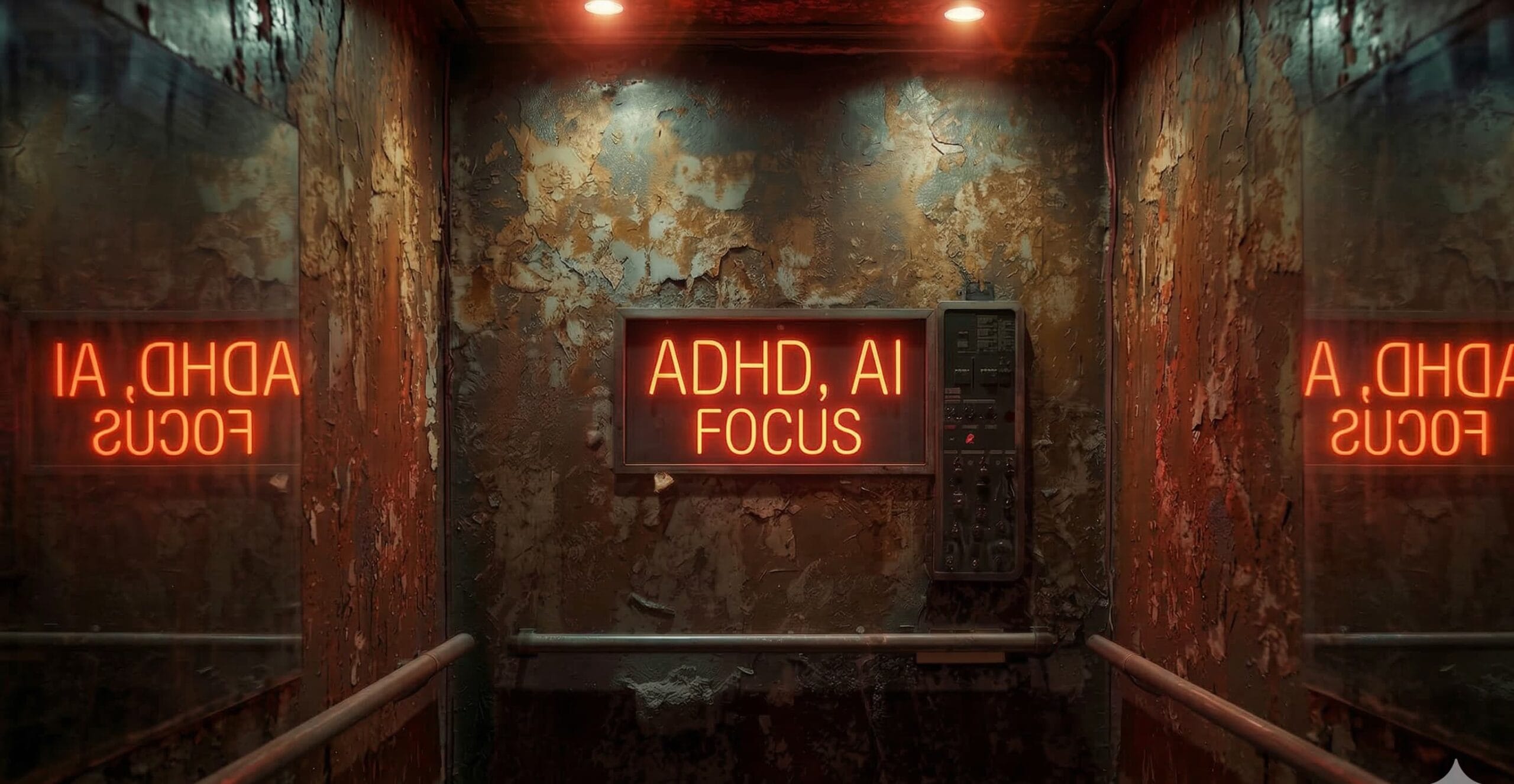Neon red sign reading "AHDH, AI – Automated Focus" glowing on a decayed, industrial concrete wall inside a dark corridor, with mirrored reflections on each side